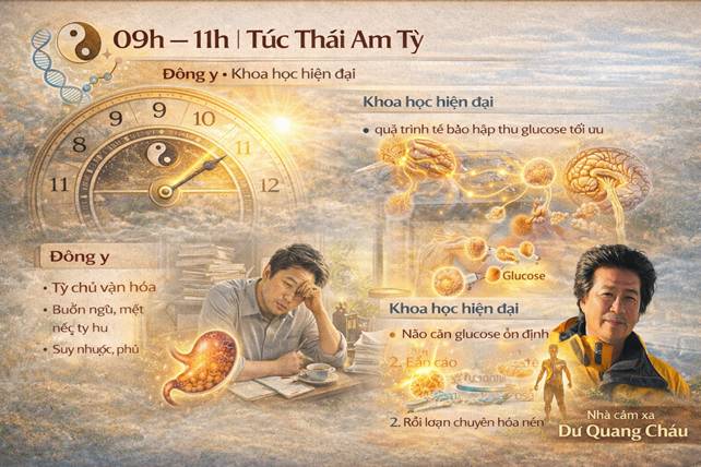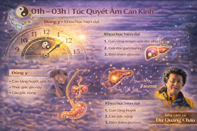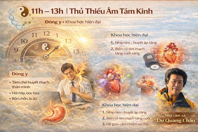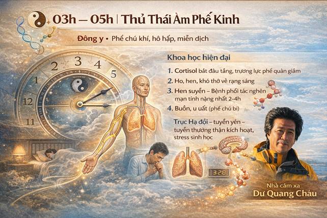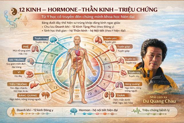 Từ Y học cổ truyền đến chứng minh khoa học hiện đại Bảng dưới đây cho thấy sự trùng khớp đáng kinh ngạc giữa: • Chu lưu Doanh khí – 12 kinh tạng phủ (Đông y) • Sinh học thời gian – thần kinh – nội tiết (y học hiện đại)