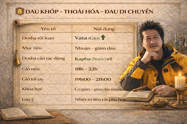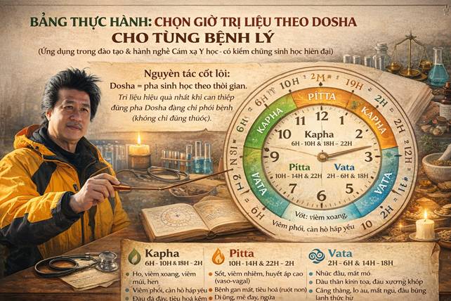 (Ứng dụng trong đào tạo & hành nghề Cảm xạ Y học – có kiểm chứng sinh học hiện đại) Nguyên tắc cốt lõi: Dosha = pha sinh học theo thời gian. Trị liệu hiệu quả nhất khi can thiệp đúng pha Dosha đang chi phối bệnh (không chỉ đúng thuốc).