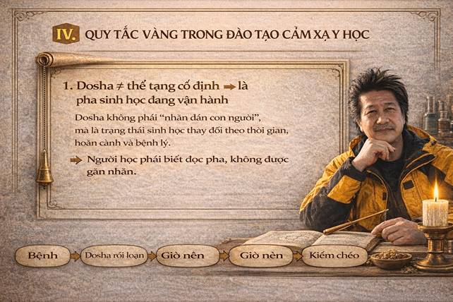Dosha không phải “nhãn dán con người”, mà là trạng thái sinh học thay đổi theo thời gian, hoàn cảnh và bệnh lý. → Người học phải biết đọc pha, không được gán nhãn.