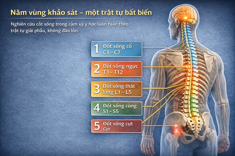 Nghiên cứu cột sống trong cảm xạ y học luôn tuân theo trật tự giải phẫu, không đảo lộn: