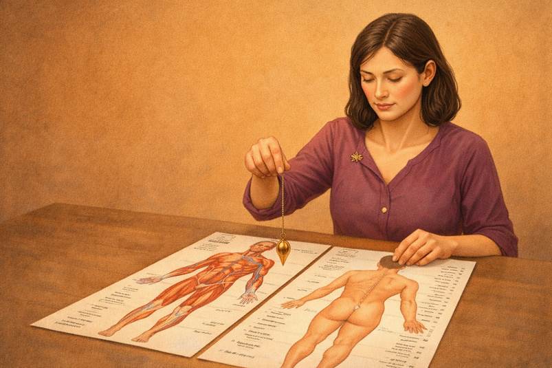 Một trong những hình thức cảm xạ gián tiếp phổ biến và khoa học nhất là làm việc trên biểu đồ giải phẫu. Người thực hành: • Đặt biểu đồ giải phẫu (mặt trước – mặt sau) trên bề mặt phẳng, • Đặt “vật chứng sinh học” (ảnh, tên, hoặc mẫu) tại vị trí quy ước, • Tiến hành khảo sát tương tự như trên cơ thể thật. Giá trị khoa học của phương pháp này nằm ở: • Khả năng chuẩn hóa vị trí khảo sát, • Giảm nhiễu do chuyển động cơ thể bệnh nhân, • Cho phép đào sâu từng hệ thống – cơ quan – vùng mô một cách có hệ thống. Biểu đồ giải phẫu là cầu nối giữa tư duy y học cổ điển và cảm xạ hiện đại.