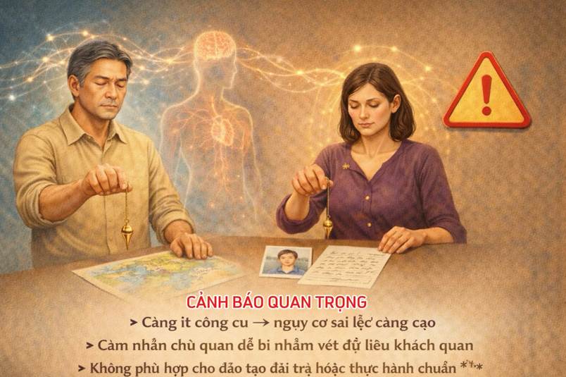 Một số người, với: • Kinh nghiệm cảm xạ sâu, • Hiểu biết giải phẫu vững chắc, • Và kỷ luật nội tâm cao, có thể chỉ dựa vào sự tập trung tinh thần để nhận biết “chỉ số” mất cân bằng, không cần que hay con lắc cảm xạ. Tuy nhiên, giáo trình nghiêm túc phải nhấn mạnh: Cảnh báo quan trọng • Càng ít công cụ → nguy cơ sai lệch càng cao • Cảm nhận chủ quan dễ bị nhầm với dữ liệu khách quan • Không phù hợp cho đào tạo đại trà hoặc thực hành chuẩn Làm được không có nghĩa là nên làm.