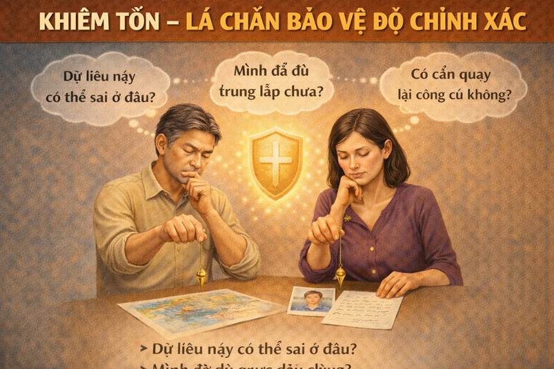 6.6. KHIÊM TỐN – LÁ CHẮN BẢO VỆ ĐỘ CHÍNH XÁC Trong cảm xạ y học, khiêm tốn không phải là thái độ đạo đức trừu tượng, mà là cơ chế bảo vệ khoa học. Người thực hành cần luôn tự hỏi: • “Dữ liệu này có thể sai ở đâu?” • “Mình đã đủ trung lập chưa?” • “Có cần quay lại công cụ không?” Khi nghi ngờ, quay về phương pháp đơn giản hơn. Khi quá tự tin, dừng lại.