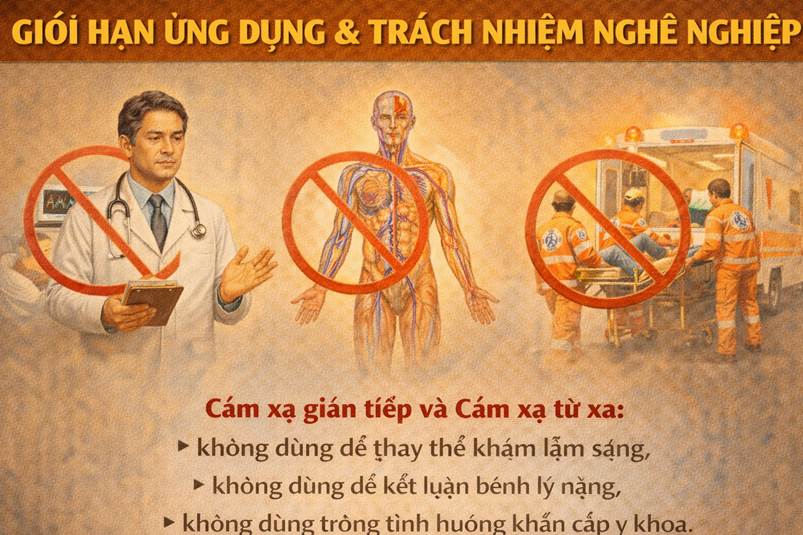 6.7. GIỚI HẠN ỨNG DỤNG & TRÁCH NHIỆM NGHỀ NGHIỆP Cảm xạ gián tiếp và Cảm xạ từ xa: • Không dùng để thay thế khám lâm sàng, • Không dùng để kết luận bệnh lý nặng, • Không dùng trong tình huống khẩn cấp y khoa. Vai trò đúng của chúng là: • Hỗ trợ định hướng, • Khoanh vùng khảo sát, • Theo dõi tiến triển trong bối cảnh an toàn.