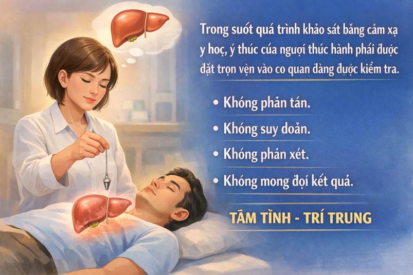 Trạng thái trung lập – cơ sở thần kinh, tâm lý & sinh học của độ chính xác trong cảm xạ y học Trong suốt quá trình khảo sát bằng cảm xạ y học, ý thức của người thực hành phải được đặt trọn vẹn vào cơ quan đang được kiểm tra. Không phân tán. Không suy đoán. Không phán xét. Không mong đợi kết quả. Nghe có vẻ đơn giản, nhưng trên thực tế, đây là điều kiện khó đạt được nhất, và cũng là yếu tố quyết định độ chính xác hay sai lệch của toàn bộ tiến trình cảm xạ. Thiếu trung lập – kết quả mất giá trị. Tôi không thể nhấn mạnh điều này đủ nhiều lần.