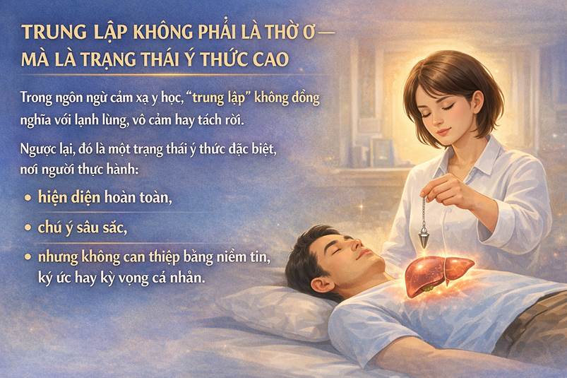 Trong ngôn ngữ cảm xạ y học, “trung lập” không đồng nghĩa với lạnh lùng, vô cảm hay tách rời. Ngược lại, đó là một trạng thái ý thức đặc biệt, nơi người thực hành: • Hiện diện hoàn toàn, • Chú ý sâu sắc, • Nhưng không can thiệp bằng niềm tin, ký ức hay kỳ vọng cá nhân. Từ góc nhìn khoa học nhận thức, đây là trạng thái: • Chú ý có định hướng thầm • Không kèm đánh giá. Trung lập là chú ý thuần khiết, không bị chi phối bởi “cái tôi”.
