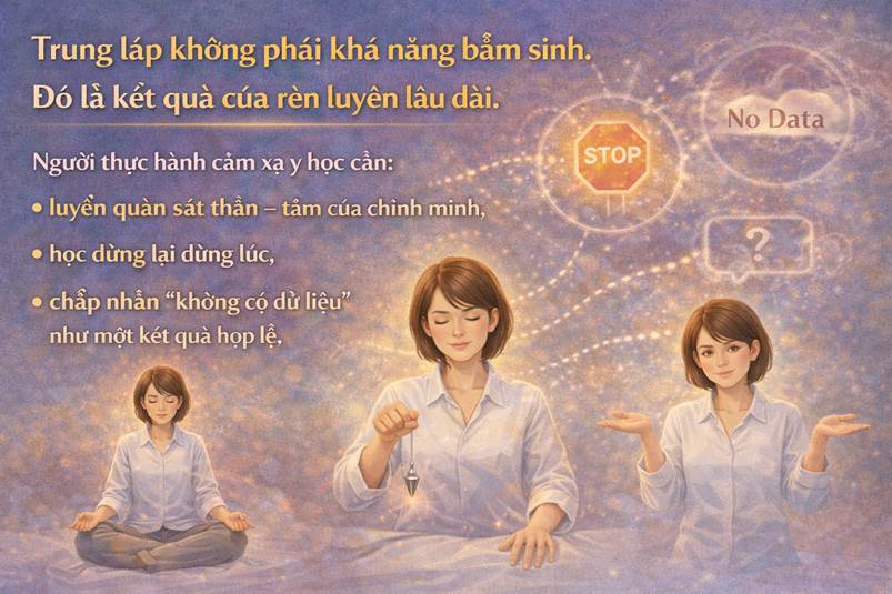 Trung lập không phải khả năng bẩm sinh. Đó là kết quả của rèn luyện lâu dài. Người thực hành cảm xạ y học cần: • Luyện quan sát thân – tâm của chính mình, • Học dừng lại đúng lúc, • Chấp nhận “không có dữ liệu” như một kết quả hợp lệ. Chính thái độ này tạo nên độ tin cậy khoa học và đạo đức của cảm xạ y học.