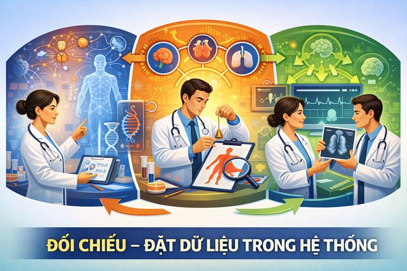 Một dữ liệu, dù ổn định khi kiểm tra lặp lại, vẫn chưa đủ nếu nó không phù hợp với bức tranh hệ thống tổng thể. Đối chiếu là bước: • Đặt kết quả vừa thu được vào mối quan hệ với các dữ liệu khác, Xem xét sự liên kết giữa: • Hệ thống chức năng, • Cơ quan liên quan, • Trục điều hòa (thần kinh – nội tiết – miễn dịch). Ví dụ: • Nếu một cơ quan được báo hiệu “liên quan”, • Nhưng hệ thống chức năng chủ quản lại hoàn toàn không phản ứng, → cần xem xét lại dữ liệu, không vội chấp nhận. Trong cảm xạ y học, dữ liệu đơn độc luôn đáng nghi.