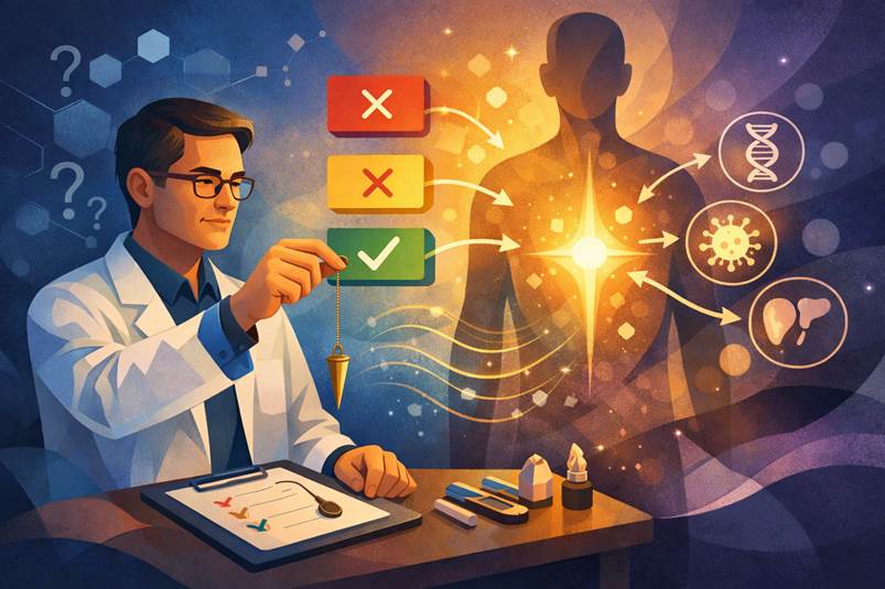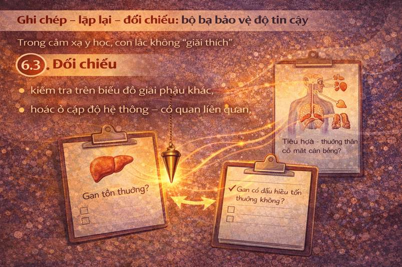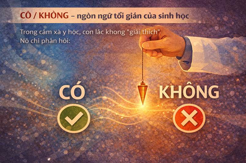 Trong cảm xạ y học, con lắc không “giải thích”. Nó chỉ phản hồi: • CÓ • KHÔNG Không hơn. Không kém. Ngôn ngữ nhị phân này có ý nghĩa khoa học sâu sắc: • Giảm tối đa diễn giải chủ quan, • Tránh xây dựng câu chuyện bệnh lý, • Giữ dữ liệu ở mức thô – trung lập – chưa suy luận. Mọi diễn giải chỉ được phép xuất hiện ở giai đoạn tổng hợp, không phải lúc thu thập dữ liệu.