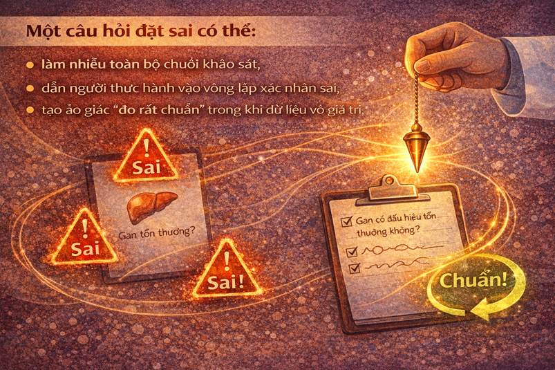 Một câu hỏi đặt sai có thể: • Làm nhiễu toàn bộ chuỗi khảo sát, • Dẫn người thực hành vào vòng lặp xác nhận sai, • Tạo ảo giác “đo rất chuẩn” trong khi dữ liệu vô giá trị. Vì vậy, trong đào tạo cảm xạ y học, cần khẳng định: Người chưa làm chủ nghệ thuật đặt câu hỏi chưa được phép gọi là người thực hành cảm xạ.
