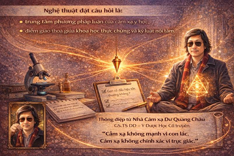 Nghệ thuật đặt câu hỏi là: • Trung tâm phương pháp luận của cảm xạ y học, • Điểm giao thoa giữa khoa học thực chứng và kỷ luật nội tâm.