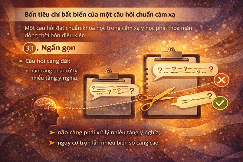Câu hỏi càng dài: • Não càng phải xử lý nhiều tầng ý nghĩa, • Nguy cơ trộn lẫn nhiều biến số càng cao. Cảm xạ không chấp nhận câu hỏi phức hợp.
