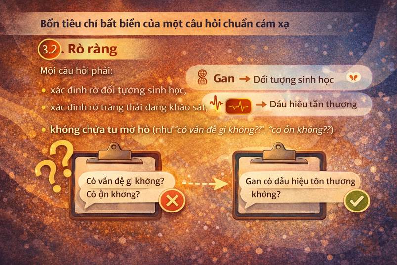 Mỗi câu hỏi phải: • Xác định rõ đối tượng sinh học, • Xác định rõ trạng thái đang khảo sát, • Không chứa từ mơ hồ (như “có vấn đề gì không?”, “có ổn không?”). Ví dụ đúng: “Liệu gan có liên quan đến tình trạng khó tiêu hiện tại không?”