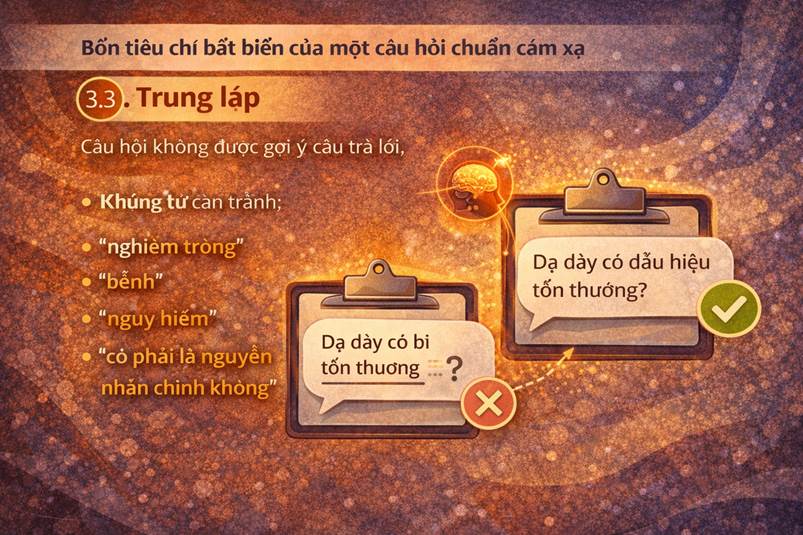 Những từ cần tránh: • “Nghiêm trọng”, • “Bệnh”, • “Nguy hiểm”, • “Có phải là nguyên nhân chính không”. Những từ này kích hoạt hệ cảm xúc – sợ hãi, làm nhiễu dữ liệu.