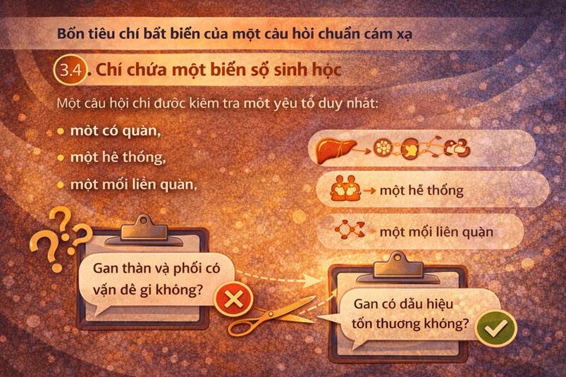 Đây là nguyên tắc quan trọng nhất. Một câu hỏi chỉ được kiểm tra một yếu tố duy nhất: • Một cơ quan, • Một hệ thống, • Một mối liên quan. Sai lầm phổ biến: “Gan hoặc dạ dày có phải là nguyên nhân gây khó tiêu không?” → Hai biến số → dữ liệu không còn giá trị.