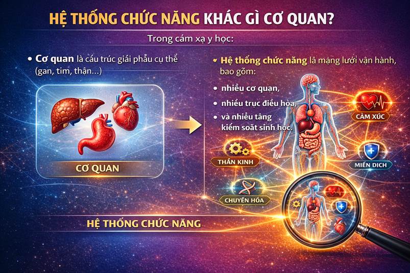 Trong cảm xạ y học: • Cơ quan là cấu trúc giải phẫu cụ thể (gan, tim, thận…) • Hệ thống chức năng là mạng lưới vận hành, bao gồm: • Nhiều cơ quan, • Nhiều trục điều hòa, • Và nhiều tầng kiểm soát sinh học. Ví dụ: • Hệ tiêu hóa không chỉ là dạ dày – ruột, • Mà còn liên quan đến: • Thần kinh ruột, • Nội tiết tiêu hóa, • Miễn dịch niêm mạc, • Và trạng thái cảm xúc. Một cơ quan có thể “bình thường”, nhưng hệ thống của nó đã rối loạn.