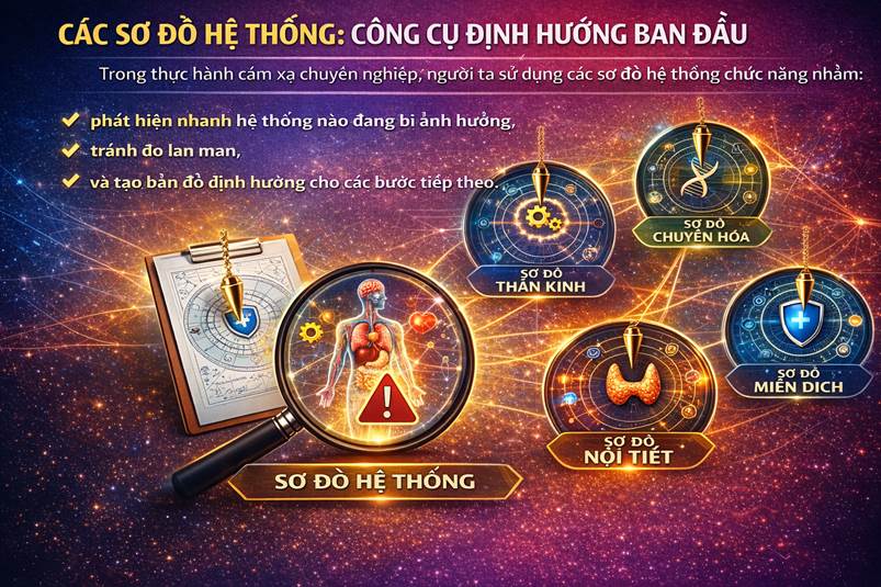 Trước khi đi vào bất kỳ nghi ngờ bệnh lý cụ thể nào, cảm xạ y học luôn thực hiện hai bước bắt buộc: • Xác định hệ thống hoặc bộ máy chức năng đang mất cân bằng • Sau đó mới đào sâu vào cơ quan – mô – biểu hiện cụ thể Đây không chỉ là một lựa chọn kỹ thuật, mà là một cách nhìn sinh học – hệ thống về con người.
