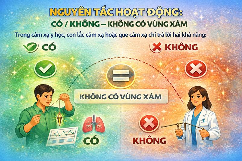 Trong cảm xạ y học, con lắc cảm xạ hoặc que cảm xạ chỉ trả lời hai khả năng: • CÓ • KHÔNG Nguyên tắc này có ý nghĩa khoa học sâu sắc: • Loại bỏ suy diễn cảm tính, • Tránh “diễn giải theo mức độ” khi chưa đủ dữ liệu, • Giữ hệ thống đo đơn giản – lặp lại – kiểm soát được. Cảm xạ càng tinh gọn về câu hỏi, càng chính xác về dữ liệu.