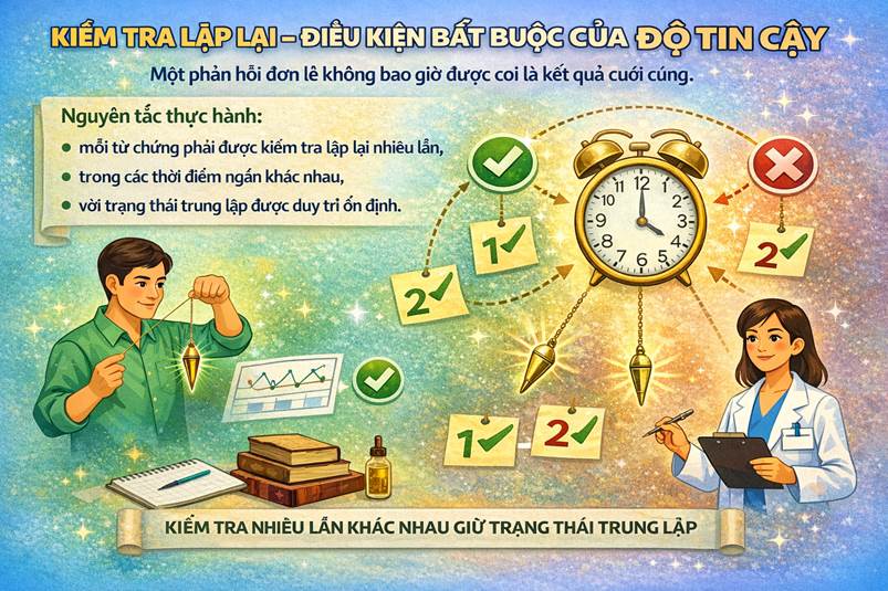 Một phản hồi đơn lẻ không bao giờ được coi là kết quả cuối cùng. Nguyên tắc thực hành: • Mỗi từ chứng phải được kiểm tra lặp lại nhiều lần, • Trong các thời điểm ngắn khác nhau, • Với trạng thái trung lập được duy trì ổn định. Chỉ khi: • Phản hồi ổn định, • Không dao động thất thường, • Không thay đổi theo cảm xúc người đo, mới được ghi nhận như dữ liệu có giá trị. Lặp lại là cách duy nhất để phân biệt tín hiệu thật và nhiễu.