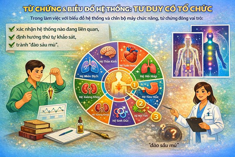Trong làm việc với biểu đồ hệ thống và chín bộ máy chức năng, từ chứng đóng vai trò: • Xác nhận hệ thống nào đang liên quan, • Định hướng thứ tự khảo sát, • Tránh “đào sâu mù”. Ví dụ, thay vì hỏi lan man: • “Có vấn đề ở gan không?” • “Có bệnh lý gì không?” Người thực hành hỏi theo trình tự hệ thống: • “Hệ tiêu hóa có liên quan không?” • “Hệ nội tiết có mất cân bằng không?” • “Hệ thần kinh tự chủ có bị ảnh hưởng không?” Từ chứng giúp tư duy cảm xạ đi từ toàn thể → bộ phận, không đi ngược lại.