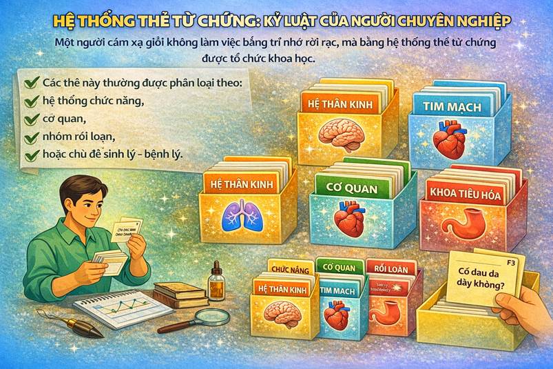 Một người cảm xạ giỏi không làm việc bằng trí nhớ rời rạc, mà bằng hệ thống thẻ từ chứng được tổ chức khoa học. Các thẻ này thường được phân loại theo: • Hệ thống chức năng, • Cơ quan, • Nhóm rối loạn, • Hoặc chủ đề sinh lý – bệnh lý. Lợi ích khoa học: • Giảm sai sót do nhớ thiếu hoặc nhớ lệch, • Tăng tính lặp lại giữa các phiên đo, • Giúp dữ liệu được kiểm soát và truy vết. Một người cảm xạ giỏi luôn là một người có tổ chức.