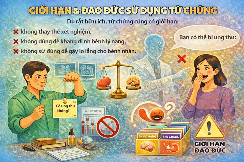 Dù rất hữu ích, từ chứng cũng có giới hạn: • Không thay thế xét nghiệm, • Không dùng để khẳng định bệnh lý nặng, • Không sử dụng để gây lo lắng cho bệnh nhân. Từ chứng là công cụ định hướng, không phải phán quyết.