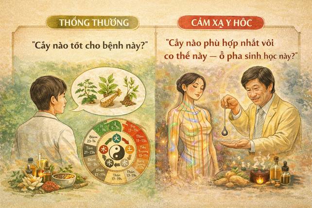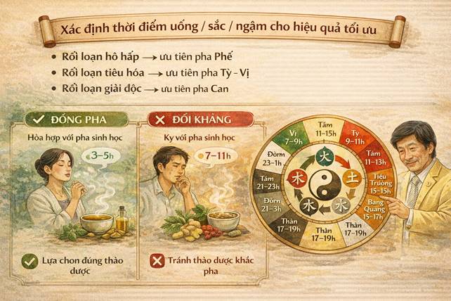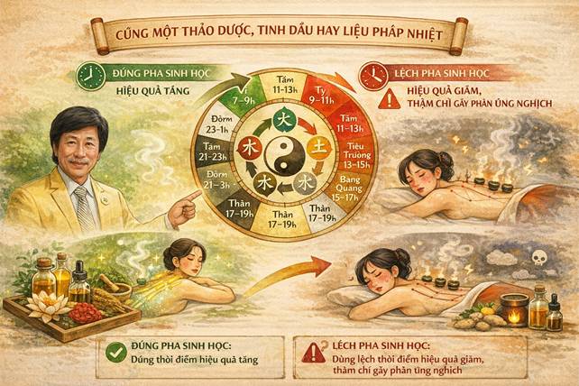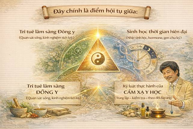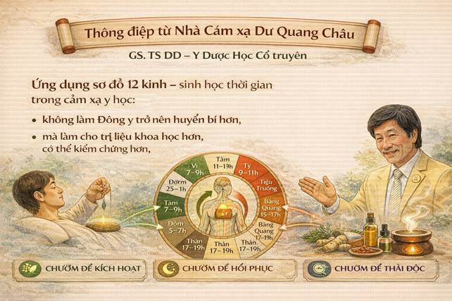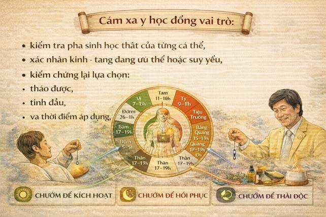 Cảm xạ y học đóng vai trò: • Kiểm tra pha sinh học thật của từng cá thể, • Xác nhận kinh – tạng đang ưu thế hoặc suy yếu, • Kiểm chứng lại lựa chọn: • Thảo dược, • Tinh dầu, • Và thời điểm áp dụng. Nguyên tắc bắt buộc: • Không áp đặt giờ kinh sách vở • Không dùng “giờ tốt – giờ xấu” mang tính định mệnh • Chỉ dùng ngôn ngữ sinh học – đáp ứng – kiểm chứng