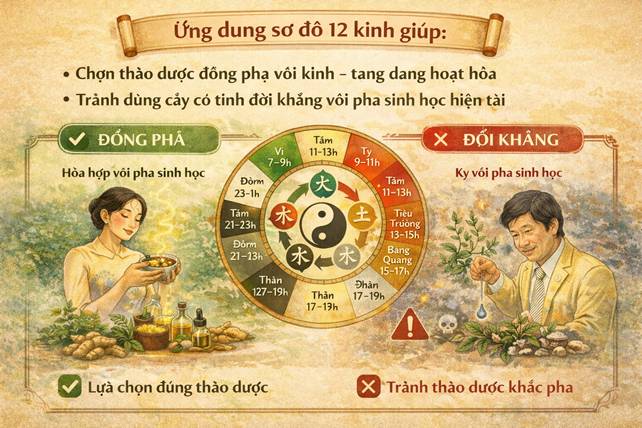 Thay vì hỏi: “Cây nào tốt cho bệnh này?” Cảm xạ y học đặt câu hỏi: “Cây nào phù hợp nhất với cơ thể này – ở pha sinh học này?” Ứng dụng sơ đồ 12 kinh giúp: • Chọn thảo dược đồng pha với kinh – tạng đang hoạt hóa • Tránh dùng cây có tính đối kháng với pha sinh học hiện tại • Xác định thời điểm uống / sắc / ngậm cho hiệu quả tối ưu Ví dụ: • Rối loạn hô hấp → ưu tiên pha Phế • Rối loạn tiêu hóa → ưu tiên pha Tỳ – Vị • Rối loạn giải độc → ưu tiên pha Can 👉 Thảo dược không chỉ “đúng bệnh”, mà phải đúng nhịp sinh học.