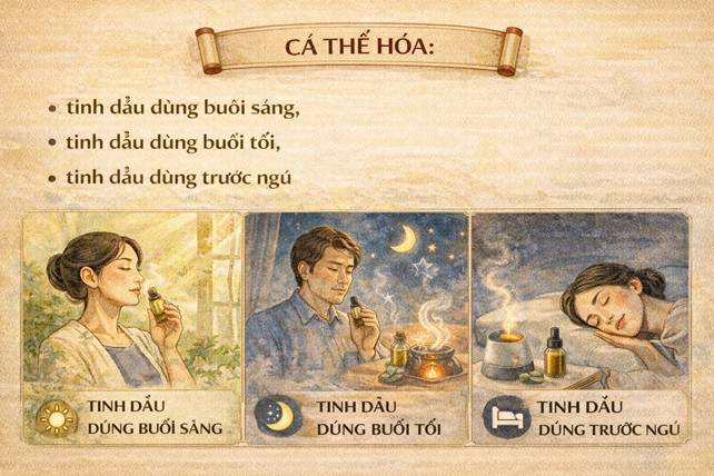 Tinh dầu tác động nhanh lên: • Hệ thần kinh, • Trục hormone, • Và hệ limbic (cảm xúc – trí nhớ). Do đó, thời điểm sử dụng đóng vai trò đặc biệt quan trọng. Ứng dụng sơ đồ 12 kinh cho phép: • Chọn tinh dầu phù hợp với pha thần kinh chi phối • Tránh kích thích thần kinh khi cơ thể đang ở pha hồi phục Cá thể hóa: • Tinh dầu dùng buổi sáng, • Tinh dầu dùng buổi tối, • Tinh dầu dùng trước ngủ 👉 Cùng một tinh dầu, dùng sai giờ có thể gây bồn chồn – mất ngủ – mệt mỏi, nhưng dùng đúng pha có thể tạo hiệu ứng an thần, tái tạo sâu.