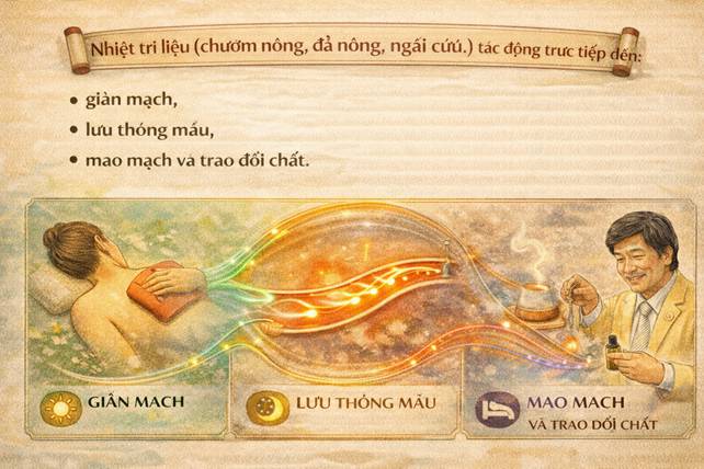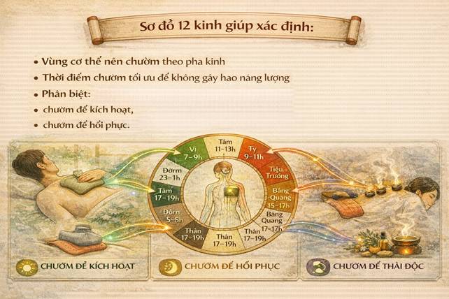 Nhiệt trị liệu (chườm nóng, đá nóng, ngải cứu…) tác động trực tiếp đến: • Giãn mạch, • Lưu thông máu, • Mao mạch và trao đổi chất. Sơ đồ 12 kinh giúp xác định: • Vùng cơ thể nên chườm theo pha kinh • Thời điểm chườm tối ưu để không gây hao năng lượng Phân biệt: • Chườm để kích hoạt, • Chườm để hồi phục, • Chườm để thải độc 👉 Nhiệt trị liệu đúng thời điểm giúp: • Tăng hiệu quả, • Giảm thời gian điều trị, • Và tránh hiện tượng “chườm nhiều mà không khỏe”.