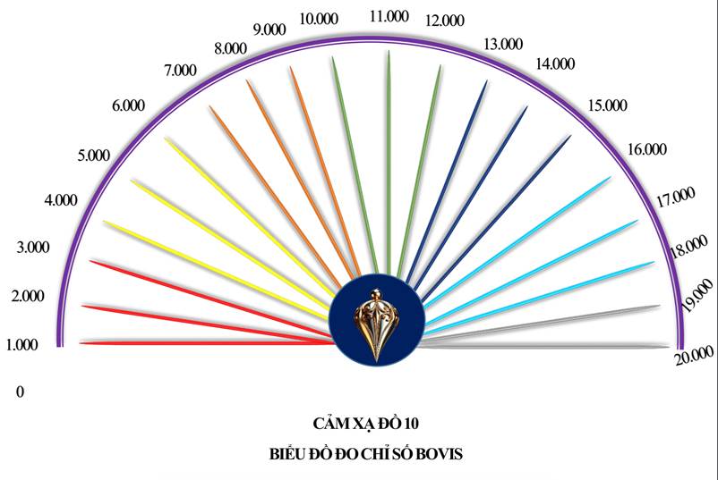 Lưu ý: • Dải Bovis lý tưởng cho người khỏe mạnh là 6.500 – 8.000 BU. • Tắc nghẽn càng cao → rung động càng thấp, màu càng tối, xoáy càng nghịch. • Bạn có thể kết hợp vẽ bản đồ năng lượng lên hình vẽ cơ thể, dùng màu/biểu tượng minh họa.