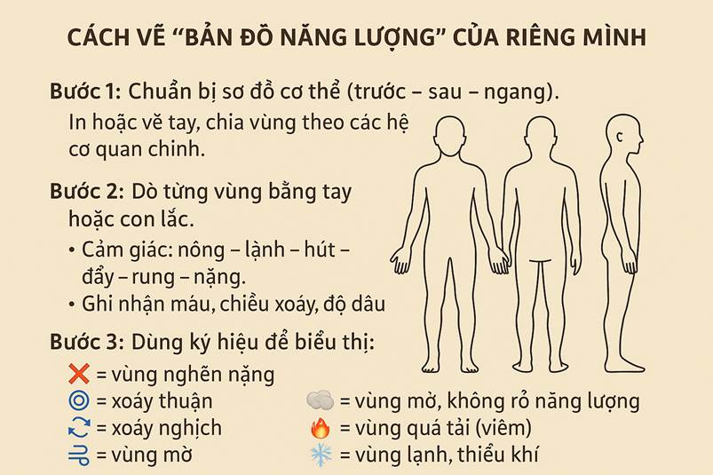 “Bản đồ năng lượng không chỉ là một tấm bản đồ – mà là tấm gương soi chiếu linh hồn, là nơi ta lắng nghe được tiếng nói của cơ thể, của cảm xúc, và của tiềm thức. Mỗi đường xoáy, mỗi vùng sáng – tối – đều kể cho ta biết: năng lượng đang lưu thông hay đang tắc nghẽn. Khi ta học cách ‘đọc’ bản đồ này bằng trái tim và trực giác, cũng là lúc ta trở thành người chữa lành cho chính mình.”
