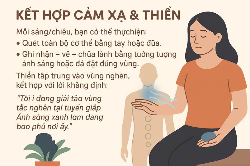 Mỗi sáng/chiều, bạn có thể thực hiện: • Quét toàn bộ cơ thể bằng tay hoặc đũa. • Ghi nhận – vẽ – chữa lành bằng tưởng tượng ánh sáng hoặc đá đặt đúng vùng. • Thiền tập trung vào vùng nghẽn, kết hợp với lời khẳng định: “Tôi đang giải tỏa vùng tắc nghẽn tại tuyến giáp. Ánh sáng xanh lam đang bao phủ nơi ấy.”