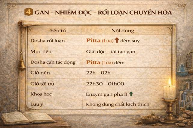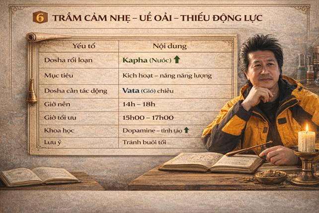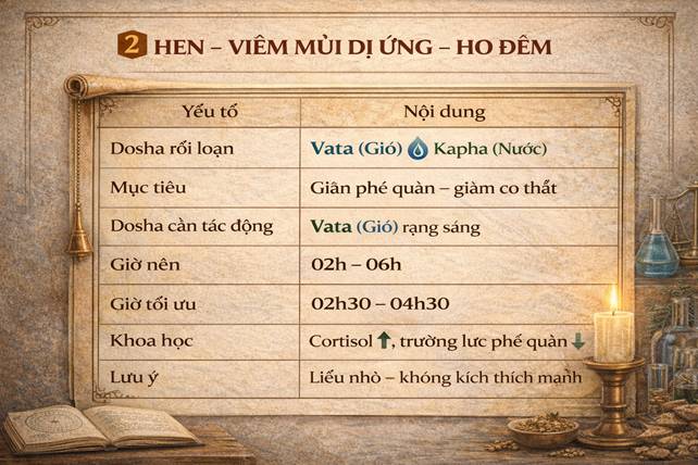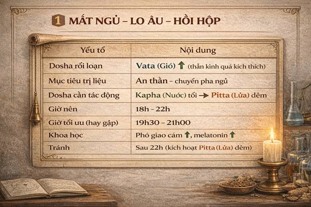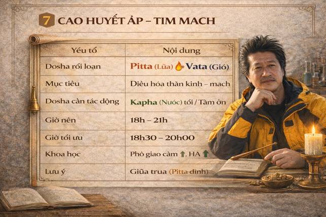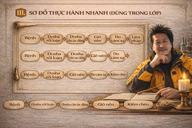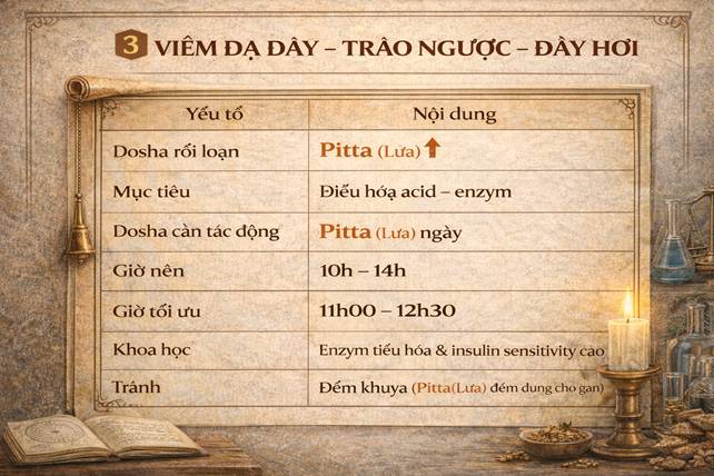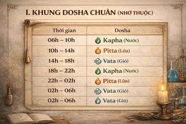 (Ứng dụng trong đào tạo & hành nghề Cảm xạ Y học – có kiểm chứng sinh học hiện đại) Nguyên tắc cốt lõi: Dosha = pha sinh học theo thời gian. Trị liệu hiệu quả nhất khi can thiệp đúng pha Dosha đang chi phối bệnh (không chỉ đúng thuốc).