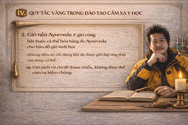 2. Giờ nền Ayurveda ≠ giờ cứng → bắt buộc cá thể hóa bằng đo Ayurveda cho bản đồ giờ sinh học, nhưng điều trị chỉ đúng khi đo được giờ đáp ứng thật của từng cơ thể.