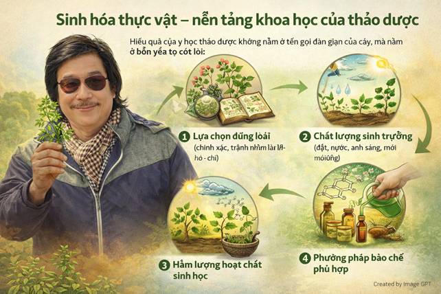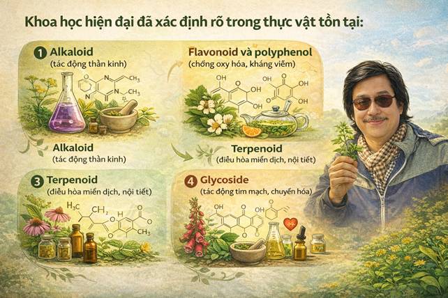 Sinh hóa thực vật – nền tảng khoa học của thảo dược Hiệu quả của y học thảo dược không nằm ở tên gọi dân gian của cây, mà nằm ở bốn yếu tố cốt lõi: • Lựa chọn đúng loài (chính xác, tránh nhầm lẫn họ – chi), • Chất lượng sinh trưởng (đất, nước, ánh sáng, môi trường), • Hàm lượng hoạt chất sinh học, • Phương pháp bào chế phù hợp. Cùng một loài cây, nhưng: • Thổ nhưỡng khác nhau, • Khí hậu khác nhau, • Độ cao khác nhau, • Và thời điểm thu hái khác nhau → có thể tạo ra sự chênh lệch lớn về nồng độ hoạt chất. Khoa học hiện đại đã xác định rõ trong thực vật tồn tại: • Alkaloid (tác động thần kinh), • Flavonoid và polyphenol (chống oxy hóa, kháng viêm), • Terpenoid (điều hòa miễn dịch, nội tiết), • Glycoside (tác động tim mạch, chuyển hóa). Chính các phân tử hóa học tự nhiên này – chứ không phải những khái niệm năng lượng mơ hồ – tạo nên tác dụng sinh học cụ thể của cây thuốc. Y học thảo dược hiện đại vì thế không đối lập với khoa học, mà là dược lý học có nguồn gốc tự nhiên.