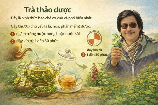 Đây là hình thức bào chế cổ xưa và phổ biến nhất. Cây thuốc (chủ yếu là lá, hoa, phần mềm) được: • Ngâm trong nước nóng hoặc nước sôi, • Đậy kín từ 1 đến 30 phút. Phương pháp này đặc biệt hiệu quả với: • Các hoạt chất tan trong nước, • Các rối loạn nhẹ đến trung bình, • Và những liệu trình cần duy trì lâu dài. Ngoài tác dụng trị liệu, trà thảo dược còn: • Làm dịu hệ thần kinh, • Tạo nhịp sinh học chậm lại, • Hỗ trợ phục hồi tinh thần.