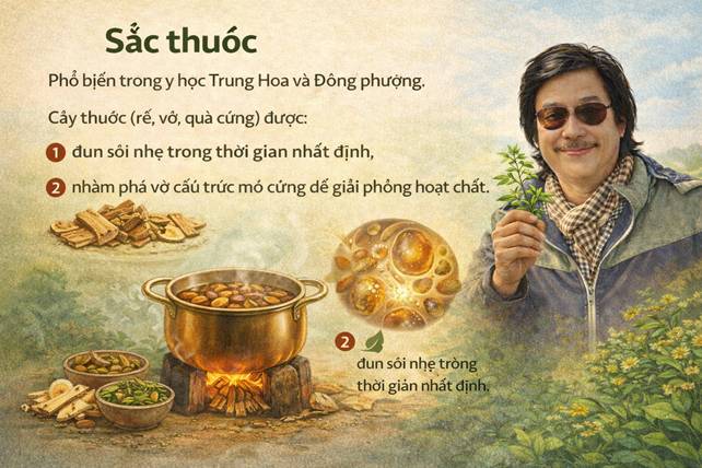 Phổ biến trong y học Trung Hoa và Đông phương. Cây thuốc (rễ, vỏ, quả cứng) được: • Đun sôi nhẹ trong thời gian nhất định, • Nhằm phá vỡ cấu trúc mô cứng để giải phóng hoạt chất. Thời gian sắc không cố định, mà phụ thuộc vào: • Độ cứng của vật liệu, • Mục tiêu trị liệu, • Và thể trạng người dùng.