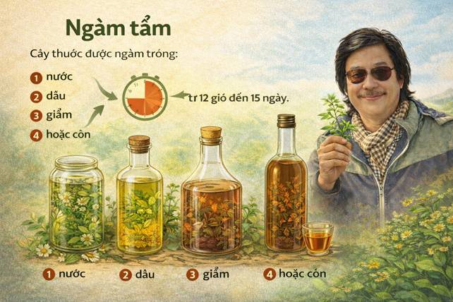 Cây thuốc được ngâm trong: • Nước, • Dầu, • Giấm, • Hoặc cồn từ 12 giờ đến 15 ngày. Dung môi quyết định: • Nhóm hoạt chất được trích ly, • Tốc độ hấp thu, • Và hướng tác động sinh học.