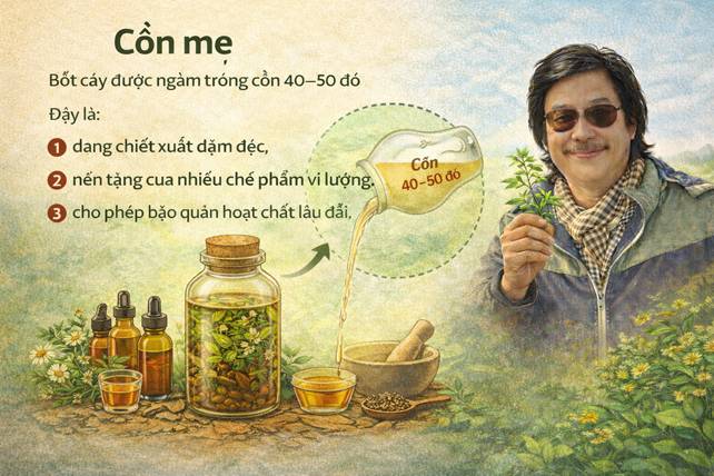 Bột cây được ngâm trong cồn 40–50 độ Đây là: • Dạng chiết xuất đậm đặc, • Nền tảng của nhiều chế phẩm vi lượng, • Cho phép bảo quản hoạt chất lâu dài. Cồn mẹ không phải vi lượng đồng căn, nhưng là cầu nối giữa: • Thảo dược cổ điển, • Và các liệu pháp liều thấp hiện đại.