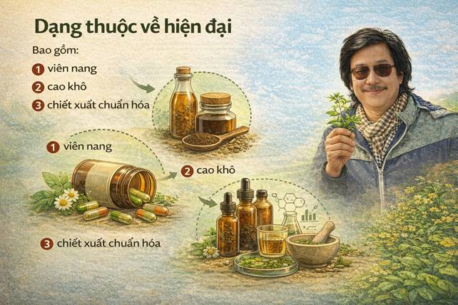 Bao gồm: • Viên nang, • Cao khô, • Chiết xuất chuẩn hóa. Ưu điểm: • Tiện lợi, • Liều lượng chính xác, • Phù hợp nhịp sống hiện đại. Tuy nhiên, chuẩn hóa không đồng nghĩa với tối ưu cho mọi cá thể. Ở đây, cảm xạ y học đóng vai trò quan trọng trong việc cá thể hóa lựa chọn.