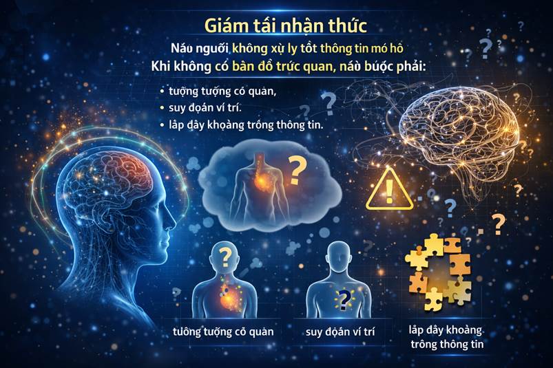 Não người không xử lý tốt thông tin mơ hồ. Khi không có bản đồ trực quan, não buộc phải: • Tưởng tượng cơ quan, • Suy đoán vị trí, • Lấp đầy khoảng trống thông tin. Điều này làm tăng hoạt động của vùng vỏ não trước trán - nơi liên quan đến phán đoán, kỳ vọng và kiểm soát ý thức – và làm suy yếu độ trung lập. Biểu đồ giải phẫu: • Cung cấp cấu trúc sẵn có, • Giảm hoạt động suy đoán, • Đưa người đo về trạng thái quan sát hơn là can thiệp.
