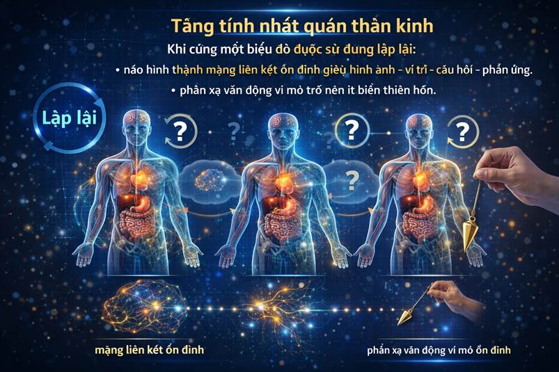 Khi cùng một biểu đồ được sử dụng lặp lại: • Não hình thành mạng liên kết ổn định giữa hình ảnh – vị trí – câu hỏi – phản ứng. • Phản xạ vận động vi mô trở nên ít biến thiên hơn. Đây là nền tảng của tính lặp lại – một tiêu chí cốt lõi của bất kỳ phương pháp nào muốn tiệm cận khoa học.