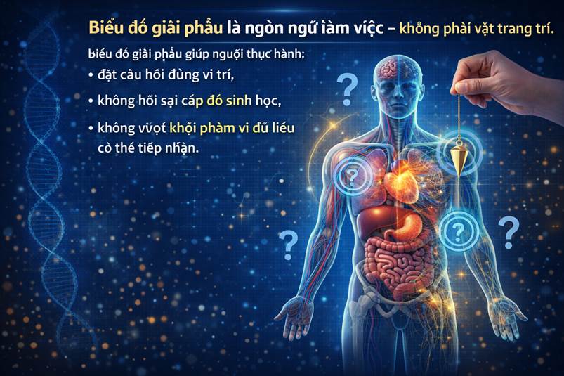Trong giáo trình cảm xạ y học, cần nhấn mạnh: Biểu đồ giải phẫu là ngôn ngữ làm việc – không phải vật trang trí. Giống như: • Bản nhạc đối với nhạc công, • Bản đồ đối với phi công, • Hay sơ đồ mạch đối với kỹ sư, biểu đồ giải phẫu giúp người thực hành: • Đặt câu hỏi đúng vị trí, • Không hỏi sai cấp độ sinh học, • Không vượt khỏi phạm vi dữ liệu có thể tiếp nhận.