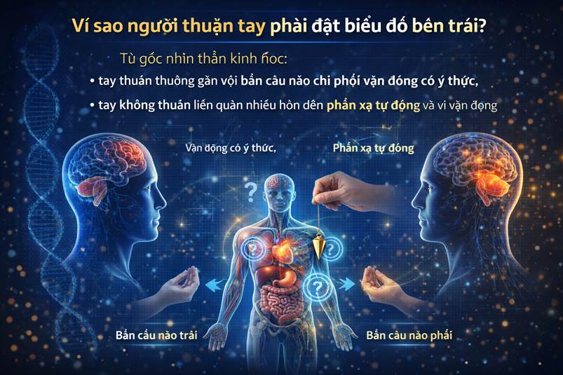 Từ góc nhìn thần kinh học: • Tay thuận thường gắn với bán cầu não chi phối vận động có ý thức, • Tay không thuận liên quan nhiều hơn đến phản xạ tự động và vi vận động. Việc: • Dùng tay không thuận để định vị cơ quan, • Tay thuận giữ con lắc – công cụ khuếch đại phản xạ, giúp tách biệt chức năng nhận thức và chức năng phản xạ, giảm can thiệp của ý chí vào chuyển động con lắc.