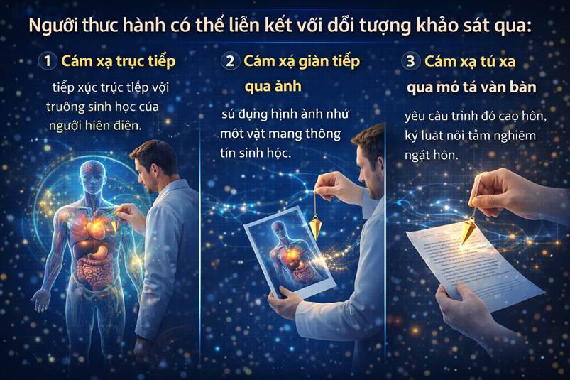 Người thực hành có thể liên kết với đối tượng khảo sát qua: 1. Cảm xạ trực tiếp – tiếp xúc trực tiếp với trường sinh học của người hiện diện. 2. Cảm xạ gián tiếp qua ảnh – sử dụng hình ảnh như một vật mang thông tin sinh học . 3. Cảm xạ từ xa qua mô tả văn bản – yêu cầu trình độ cao hơn, kỷ luật nội tâm nghiêm ngặt hơn. Dù ở hình thức nào, biểu đồ giải phẫu vẫn là trục cố định, giúp dữ liệu không trôi theo cảm xúc hoặc tưởng tượng.