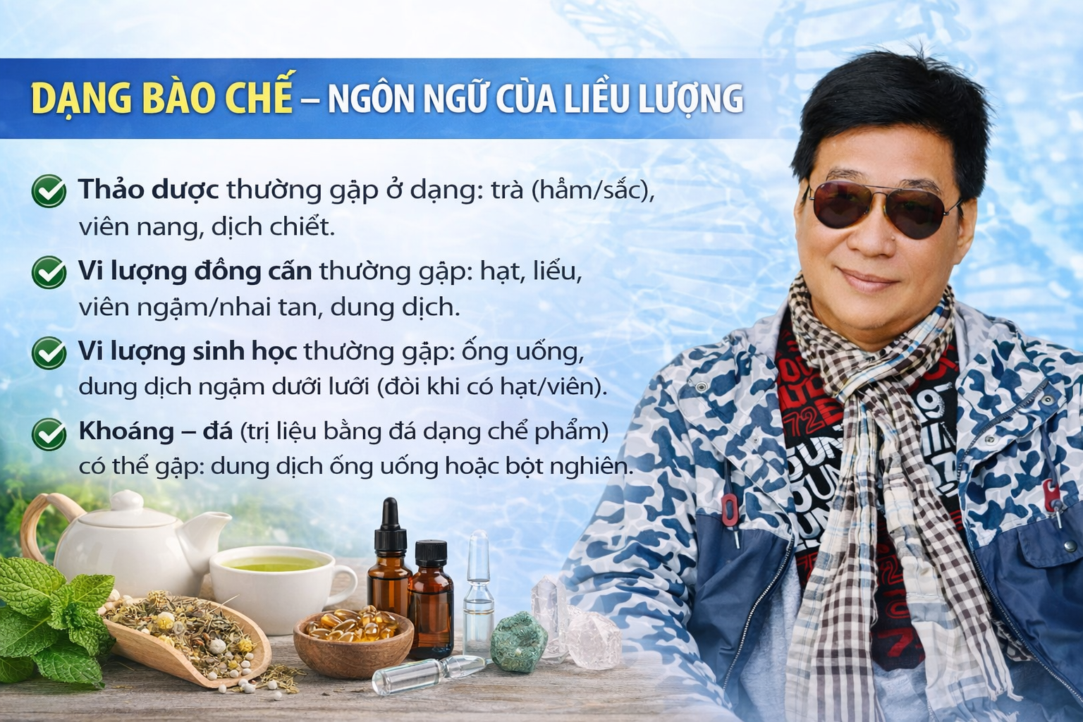 Một sai lầm phổ biến là nói “liều” như một khái niệm trừu tượng. Thực tế, liều lượng luôn gắn với dạng bào chế: • Thảo dược thường gặp ở dạng: trà (hãm/sắc), viên nang, dịch chiết. • Vi lượng đồng căn thường gặp: hạt, liều, viên ngậm/nhai tan, dung dịch. • Vi lượng sinh học thường gặp: ống uống, dung dịch ngậm dưới lưỡi (đôi khi có hạt/viên). • Khoáng – đá (trị liệu bằng đá dạng chế phẩm) có thể gặp: dung dịch ống uống hoặc bột nghiền. Khi bạn đo liều lượng, bạn không đo một con số “đẹp”. Bạn đo mức cơ thể chấp nhận được qua một hình thức cụ thể: giọt, ống, viên, hạt. Đo liều đúng là đo “khả năng tiếp nhận” chứ không chỉ đo “mức độ tác động”.