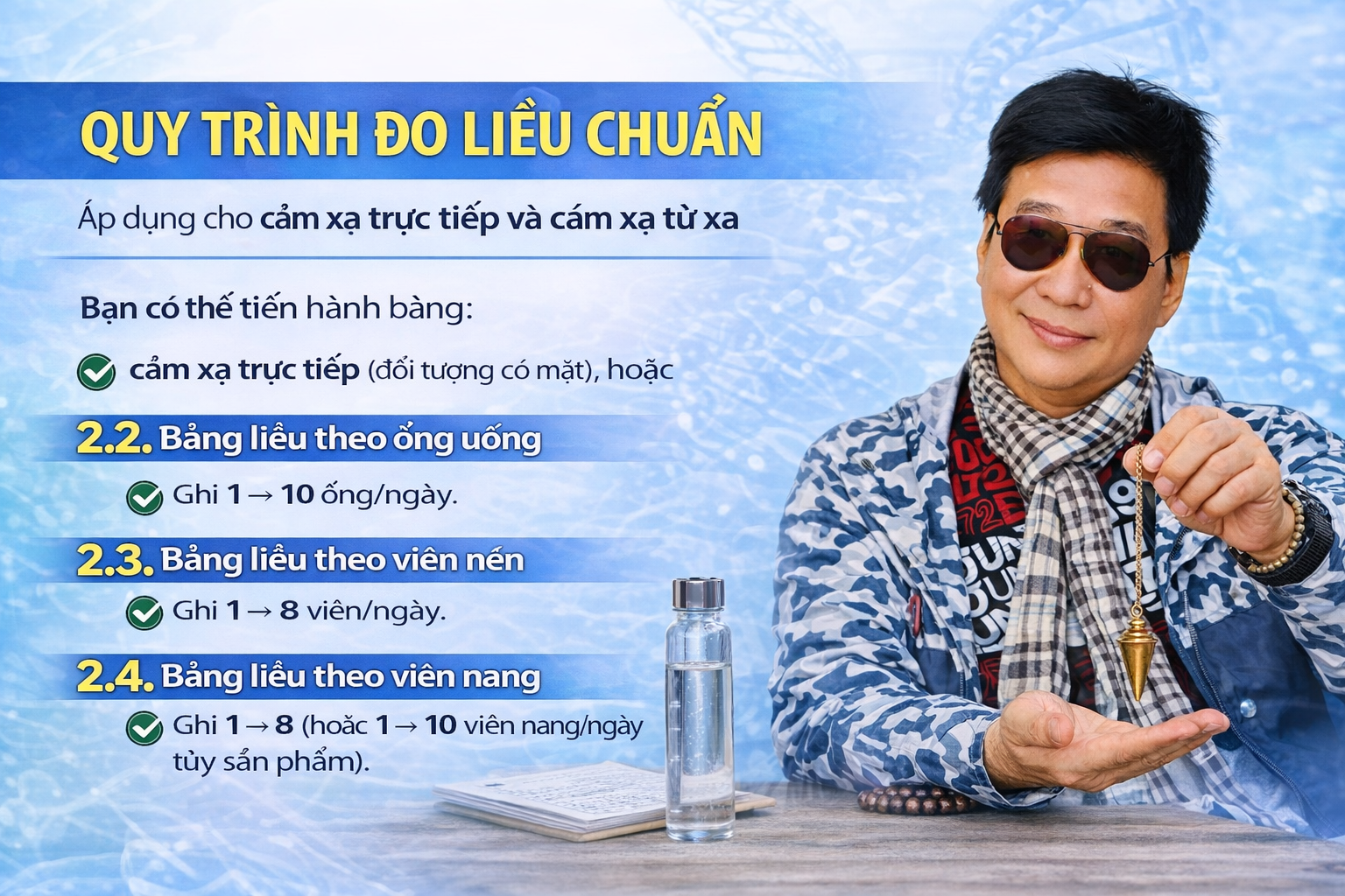 Áp dụng cho cảm xạ trực tiếp và cảm xạ từ xa Bạn có thể tiến hành bằng: • Cảm xạ trực tiếp (đối tượng có mặt), hoặc • Cảm xạ từ xa (ảnh/thông tin nhận diện rõ ràng). Bố trí • Đặt bảng liều ở bên trái (nếu thuận tay phải). • Đặt bệnh nhân/ảnh trước mặt. • Thiết lập trạng thái trung lập, kết nối ổn định. Câu hỏi chuẩn hóa (ví dụ) “Người này (nêu tên) có cần dùng 1 ống [chế phẩm X] mỗi ngày không?” Nếu phản hồi không, chuyển sang mức tiếp theo: “Có cần 2 ống mỗi ngày không?” “Có cần 3 ống mỗi ngày không?” Thường liều ống uống hiếm khi vượt quá 3 ống/ngày, nên quá trình này khá nhanh. Với viên nang, viên nén, hạt… thời gian có thể lâu hơn vì dải lựa chọn rộng và phản hồi đôi khi tinh tế. Với dạng giọt, dải liều có thể rất lớn, vì vậy cần chia bậc thông minh (ví dụ tăng theo cụm) để tránh đo quá dài. Quy tắc vàng Luôn lặp lại nghiên cứu nhiều lần để xác nhận. Một lần đo chỉ là một “gợi ý”. Hai – ba lần trùng nhau mới tạo thành dữ liệu đáng tin.