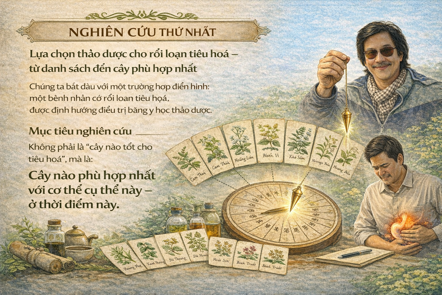 Lựa chọn thảo dược cho rối loạn tiêu hóa – từ danh sách đến cây phù hợp nhất Chúng ta bắt đầu với một trường hợp điển hình: một bệnh nhân có rối loạn tiêu hóa, được định hướng điều trị bằng y học thảo dược. Mục tiêu nghiên cứu Không phải là “cây nào tốt cho tiêu hóa”,mà là: Cây nào phù hợp nhất với cơ thể cụ thể này – ở thời điểm này. Chuẩn bị: • Danh sách từ chứng chuẩn hóa liên quan đến thảo dược tiêu hóa (tham khảo trang tương ứng). • Ghi chú thực hành đặt bên trái (nếu thuận tay phải). • Thiết lập kết nối với bệnh nhân: • Cảm xạ trực tiếp nếu bệnh nhân có mặt, • Hoặc cảm xạ từ xa thông qua ảnh hoặc thông tin văn bản. Nguyên tắc bắt buộc Giữa mỗi câu hỏi về một loại cây, phải tái thiết lập kết nối với bệnh nhân. Không “hỏi dồn”. Không “so sánh trong đầu”. Câu hỏi chuẩn “Loại cây này có phù hợp để hỗ trợ điều trị các rối loạn tiêu hóa của người này hay không?” Bạn sẽ nhận được nhiều phản hồi tích cực sơ bộ – đó là điều bình thường. Bước tinh lọc – nơi kỹ năng bắt đầu phân hóa Giả sử bạn đã chọn trước ba cây có phản hồi tích cực: atiso – bạc hà – bồ công anh. Bây giờ, bạn không hỏi “có hay không” nữa, mà quan sát biên độ dao động của con lắc. Câu hỏi “Atiso có phải là loại cây phù hợp nhất để hỗ trợ tiêu hóa cho người này không?” Lặp lại với từng cây. Nguyên tắc then chốt: Cây có biên độ dao động lớn, rõ, tự do và ổn định nhất → là cây phù hợp nhất. Từ đây, người thực hành học được một kỹ năng cốt lõi: định lượng phản hồi cảm xạ, không chỉ đọc đúng/sai.
