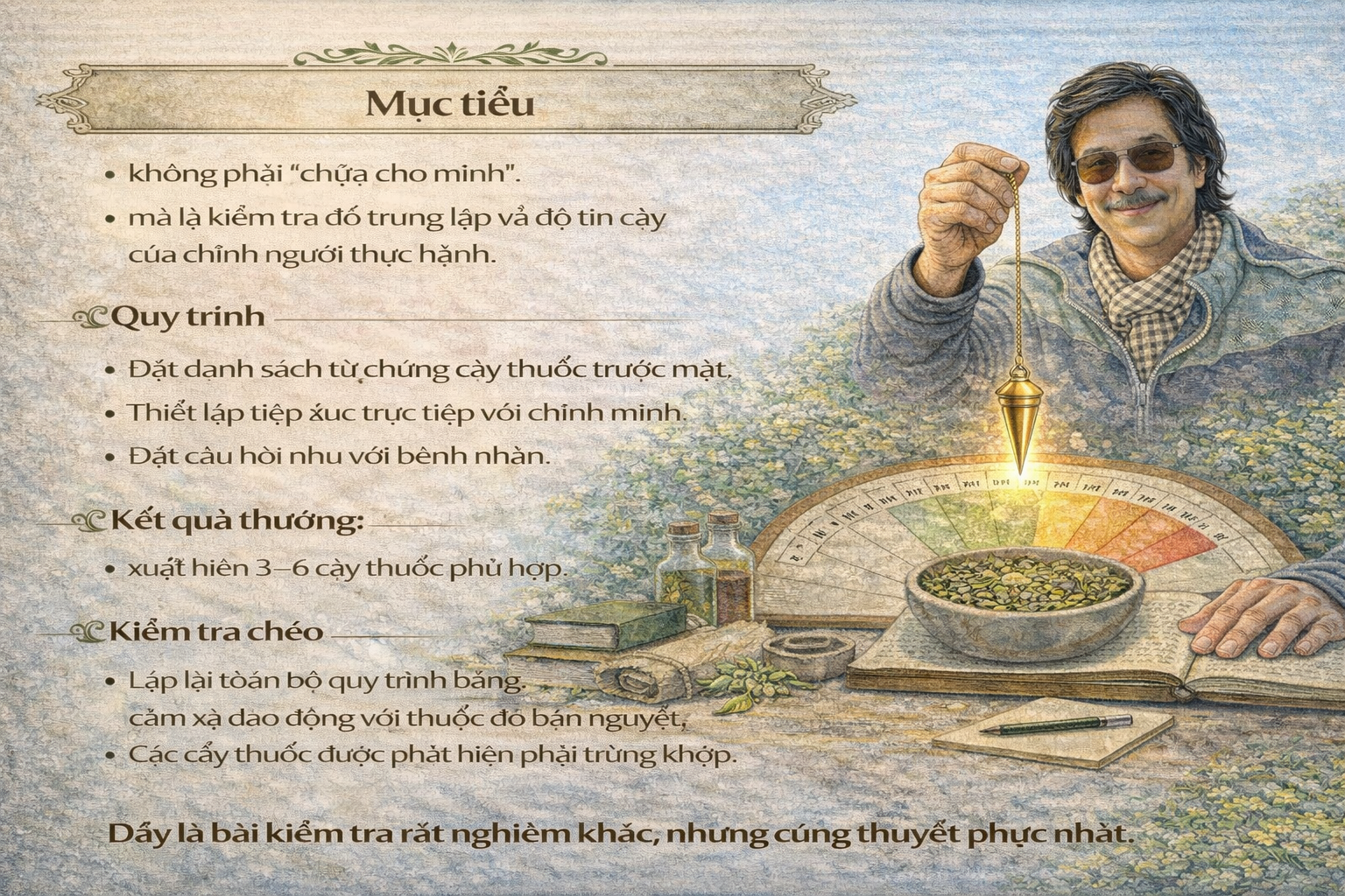 Cây cỏ trong y dược học cổ truyền – tự nghiên cứu để kiểm chứng độ trung lập Nghiên cứu cuối cùng được thực hiện trên chính bạn, với y dược học cổ truyền Mục tiêu • Không phải “chữa cho mình”, • Mà là kiểm tra độ trung lập và độ tin cậy của chính người thực hành. Quy trình • Đặt danh sách từ chứng cây thuốc trước mặt. • Thiết lập tiếp xúc trực tiếp với chính mình. • Đặt câu hỏi như với bệnh nhân. Kết quả thường: • Xuất hiện 3–6 cây thuốc phù hợp. Kiểm tra chéo • Lặp lại toàn bộ quy trình bằng cảm xạ dao động với thước đo bán nguyệt. • Các cây thuốc được phát hiện phải trùng khớp. Đây là bài kiểm tra rất nghiêm khắc, nhưng cũng thuyết phục nhất. KẾT LUẬN Từ kỹ thuật đến phẩm chất người cảm xạ Qua các ví dụ trên, một chân lý cốt lõi từ: